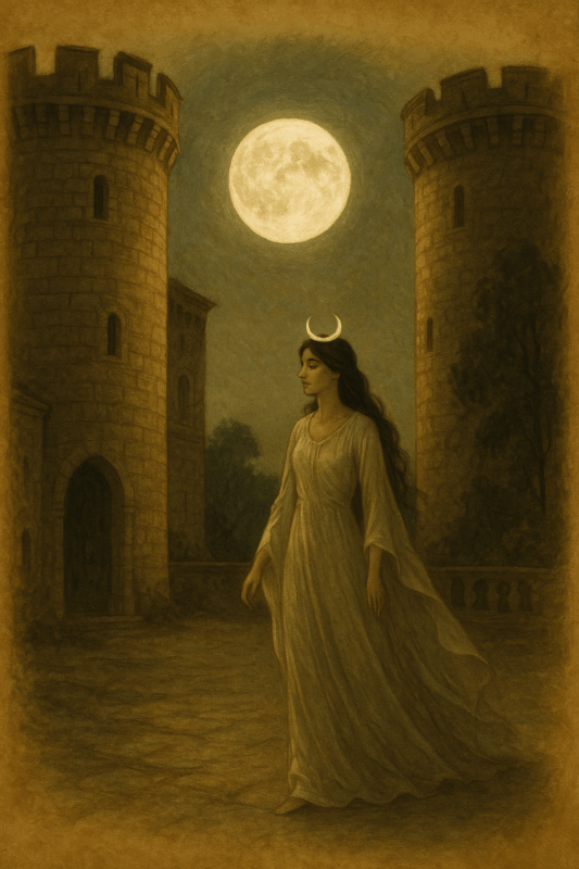 Ceux qui veillent à cette heure-là affirment voir passer, dans un silence d’air tiède, une silhouette drapée de soie claire, le front ceint d’un croissant de lune.